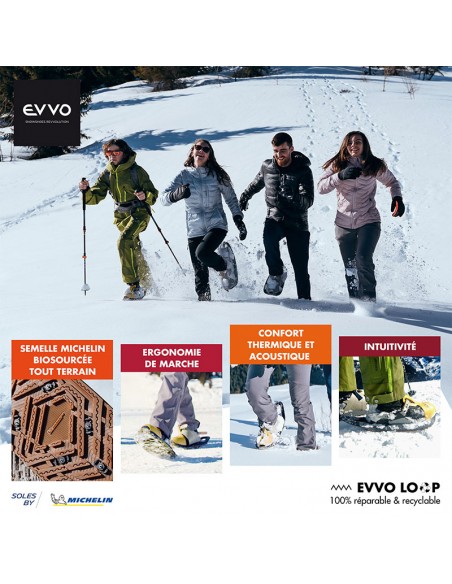 Ausgestattet mit einer einzigartigen Technologie, dank seiner zu 90 % biobasierten Sohle und dem zu 100 % recycelbaren Obermaterial, wurde dieses Produkt gemeinsam von den Teams von EVVO und Michelin mit einem einzigen Ziel entwickelt: Ihnen das Laufen im Schnee zu erleichtern und gleichzeitig die Umwelt zu schonen.