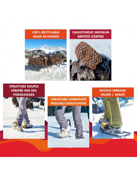 Ein intuitives Verstellsystem, das eine einfache Anpassung an alle Arten von Schuhen ermöglicht. Ein von Podologen bescheinigtes ergonomisches Design, das einen natürlichen Bewegungsablauf beim Gehen gewährleistet. Eine einzigartige Sohle, die in Zusammenarbeit mit Michelin entwickelt wurde, leicht und leise ist und echten Offroad-Grip bietet, der Griffigkeit und Haltbarkeit garantiert.