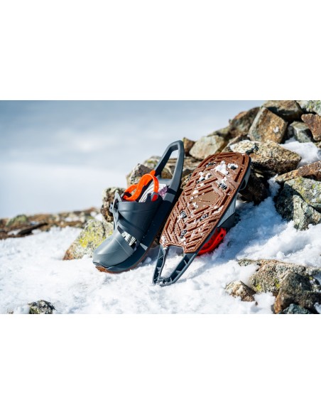 Ein intuitives Verstellsystem, das eine einfache Anpassung an alle Arten von Schuhen ermöglicht. Ein von Podologen bescheinigtes ergonomisches Design, das einen natürlichen Bewegungsablauf beim Gehen gewährleistet. Eine einzigartige Sohle, die in Zusammenarbeit mit Michelin entwickelt wurde, leicht und leise ist und echten Offroad-Grip bietet, der Griffigkeit und Haltbarkeit garantiert.