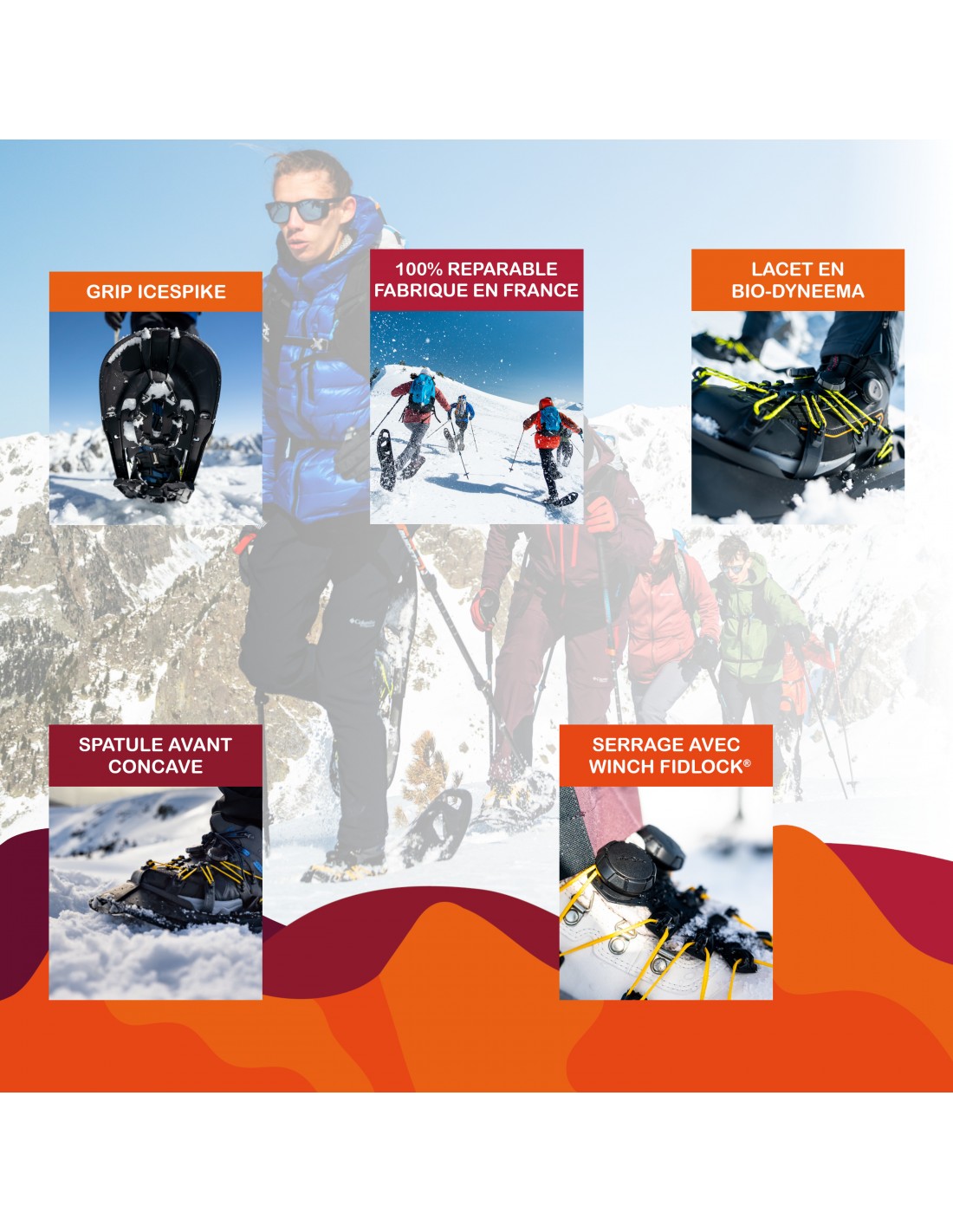 La Nordee se distingue par sa structure brevetée composée de deux tamis légers et indépendants, offrant une portance proportionnelle à votre pointure. Ce système innovant glisse pour s'adapter à la taille de vos chaussures, garantissant une flottabilité optimale dans la neige profonde.